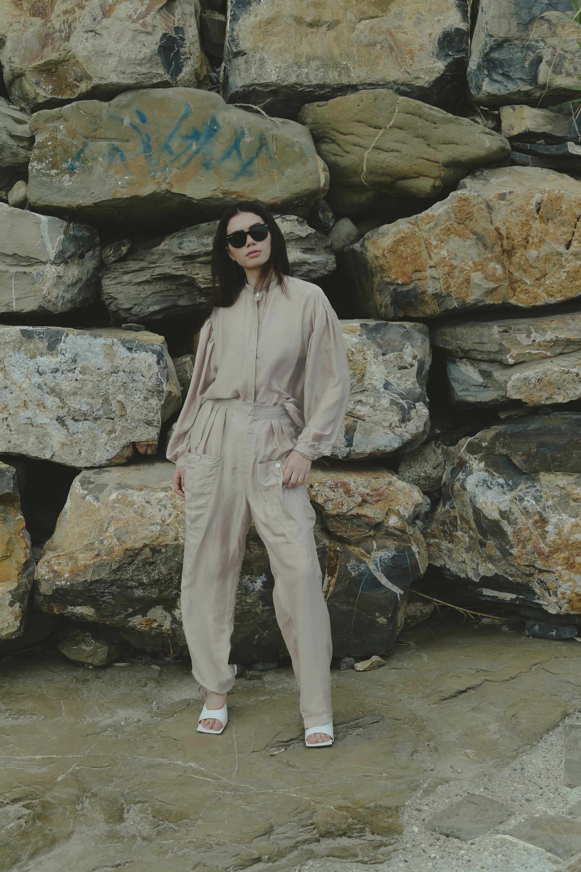 Introducing our stunning silk set in a timeless shade of beige, featuring an oversize shirt and high-waisted relaxed trousers. Crafted from the finest silk fabric, this set combines luxury and comfort to create an effortlessly chic look.