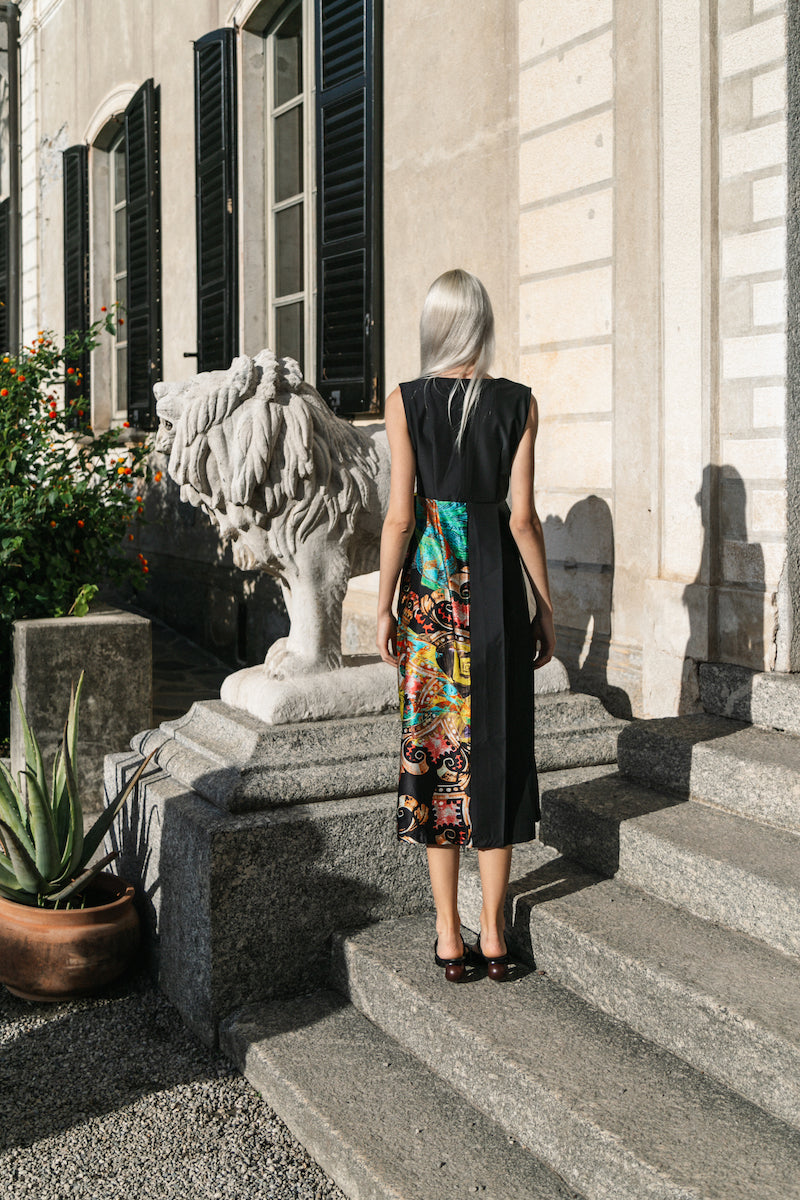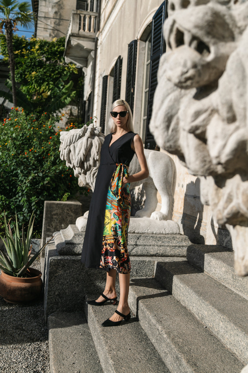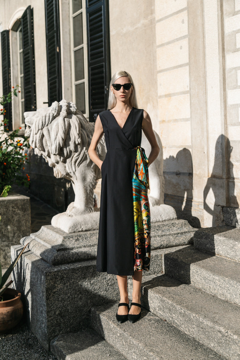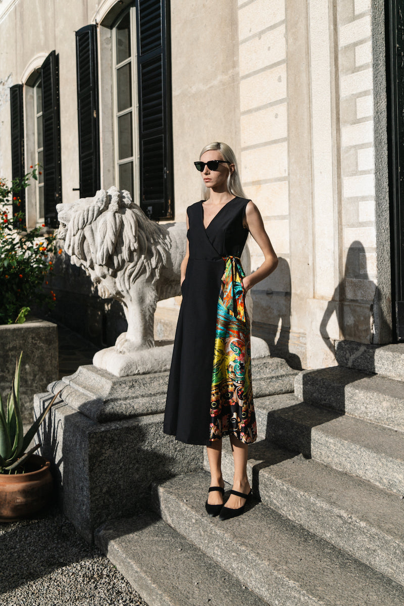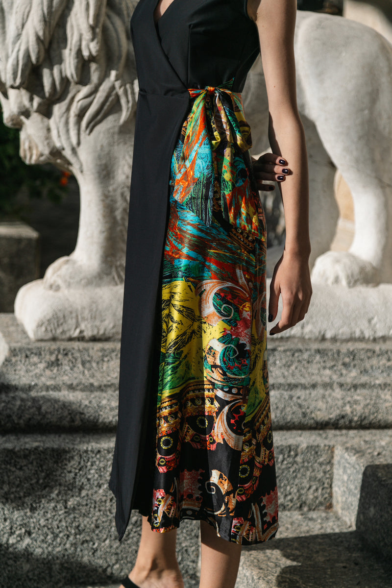 The Wander dress was created in bright right colors and radiant patterns that bring personality from all over the world to inspire confidence and vivaciousness whenever wearing the dress. With a wrap-waist tie, magnificent silk fabric, and vibrant handcrafted pattern the chic dress is made to complement any body type. Fashionable for all heights, the black silk and clean lines of the dress elongate and slenderize the wearer. Inspired by Japanese design and durability, the dress is handmade to be a wardrobe staple for years to come.